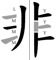 此外,很多初學者都不明白為何「非」字的字身取「YYY」,而不取「LMM」,其實也是同樣的原理。如果「非」字的字身取「LMM」,那不就是說該字的字身是由「LMMM」組成?「LMMM」和「YYY」相比,多了一個碼,因此,「YYY」比較精簡。
