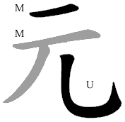 「元」字的第二個字型「M」,不是「一劃」,而是「一劃一撇」(如圖所示)。由於 MMU 的組合比 MMHU 精簡,所以選擇前者。